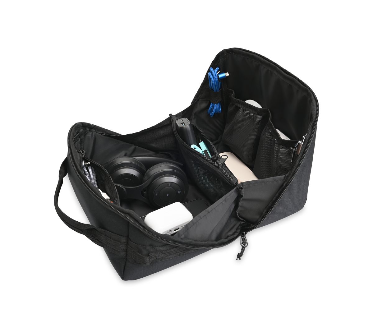 Streamline your tech essentials with the Newton Fold Out Tech Organizer. Designed for on-the-go professionals, it unfolds into a compact, organized workspace with mesh pockets, pen loops, and zip compartments for chargers, adapters, and more. A built-in divider, gusseted side panel, and stable orientation keep everything in place. With a grab handle and external attachment points, it’s made for easy travel. PVC-free and perfectly practical.