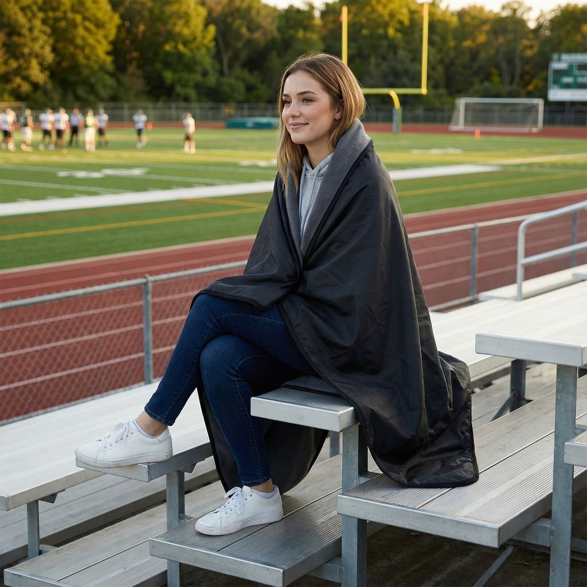 Keep warm and comfortable at stadiums, concerts, tailgates, and outdoor events with this versatile fleece stadium blanket. This stadium blanket features a soft polar fleece on one side and waterproof nylon on the other. The blanket easily folds up and stores in the included tote bag, which features a handle. The bag also includes an external pocket, ideal for quick access to your keys, phone, or other game-day essentials. Add your logo or team branding to the front pouch for a standout promotional gift perfect for schools, sports teams, and fan merchandise.