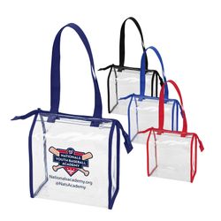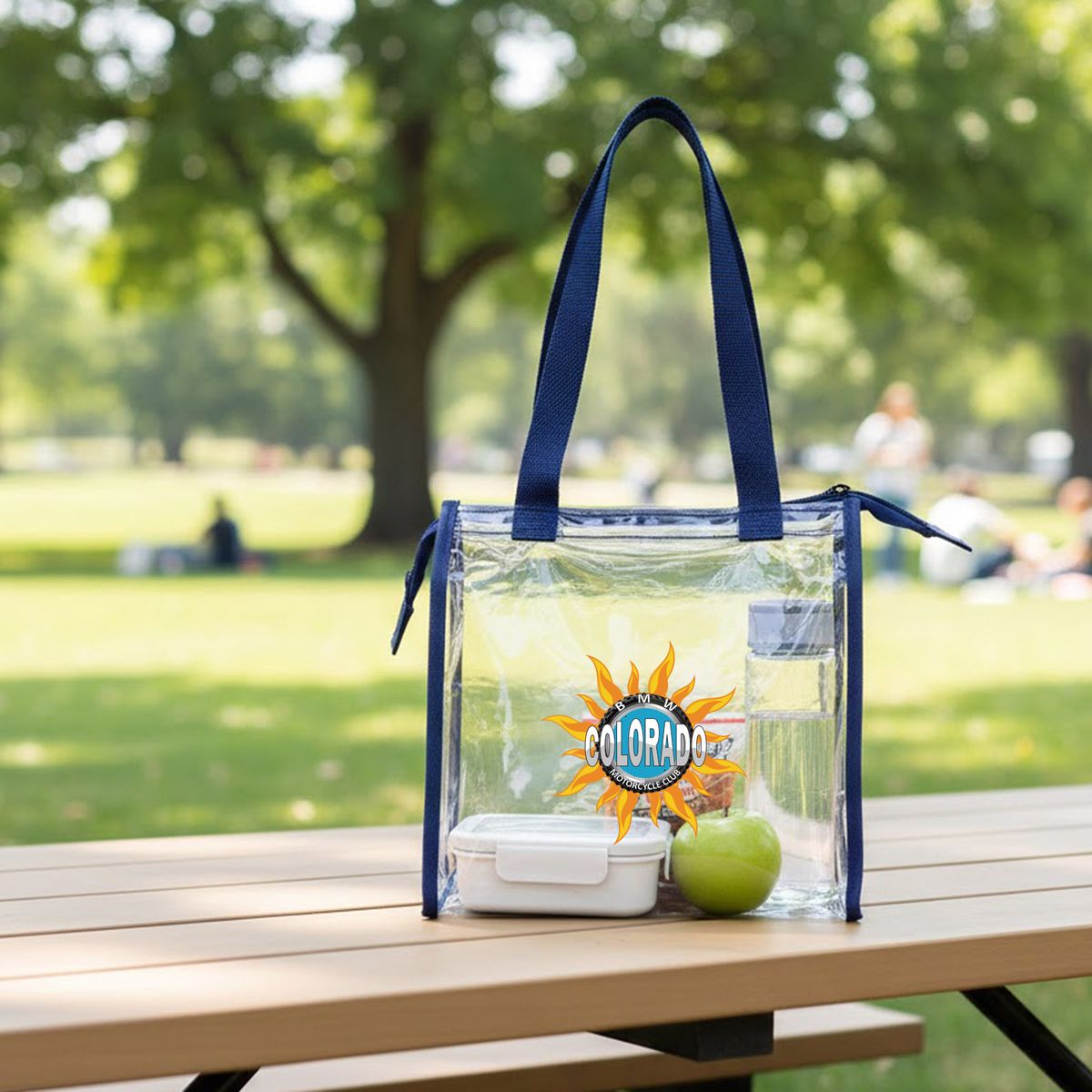This small clear tote bag with a top zipper closure and two 20" handles is perfect for securely storing food and essentials at events and everyday outings. Made from durable 0.3mm PVC and a sturdy 600 denier base, it easily passes through security checks at stadiums, concerts, or airports. The compact design includes a secure zippered interior to keep your items safe, while the vibrant colored trim adds a touch of style. With comfortable 20" handles, it offers convenient, hands-free carrying. Whether you're heading to an event, traveling, or just on the go, this transparent tote combines practicality with effortless style. (T5205)